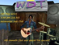 Una serata speciale nella quale Nik Hamelin saluta con un ultimo concerto pubblico i suoi fan ed amici... Ovviamente non sparisce e continuerà a cantare per piccoli e speciali eventi, ma il suo percorso musicale come artista girovago sui palchi di tutta second life finisce qui.....ora torna a fare il cantastorie per pochi amici innamorati della sua voce.